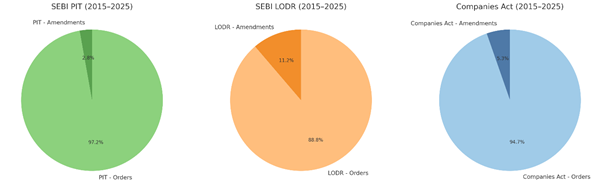 Cut two, in last 10 years [‘2015-2025’] we have seen 212 amendments in Companies act, 2013 (including act and rules), 38 amendments in Securities and Exchange Board of India (Listing Obligations and Disclosure Requirements), regulations, 2015 [‘SEBI LODR’] regulations and 13 amendments in PIT regulations. We have seen 3761 number of orders getting passed by MCA and 300 plus and 450 plus orders passed by SEBI under adjudication process under SEBI LODR and Securities and Exchange Board of India (Prohibition of Insider Trading) regulation 2015 [‘SEBI PIT’] respectively. Pie chart depicting same is specified below: