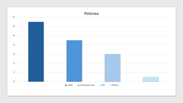 Under SEBI LODR, 13 policies are required to be adopted by the board of directors of a listed entity. Below chart provides number of policies required to be framed under SEBI LODR, companies act and PIT:
