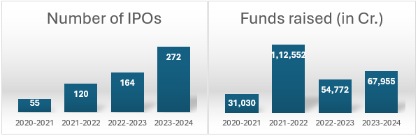 (Image 1: Number of IPOs and Funds Raised from year 2020-21 to 2023-24)